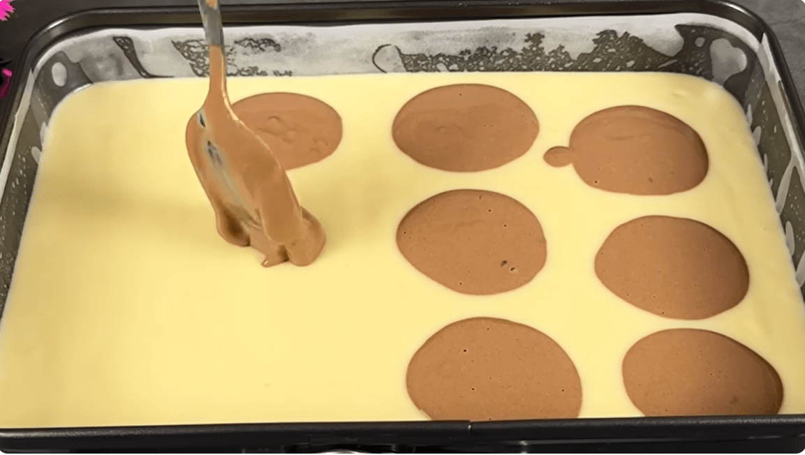 Potom kašikom rasporedite fil preko tijesta – možete ga stavljati u tačkicama, linijama ili ga nježno prošarati viljuškom za lijep mramorni efekat.