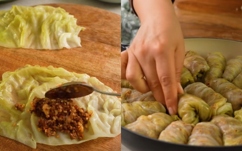 Počnite s listom kupusa; ako je list velik, podijelite ga na dva dijela. Uklonite žilavi dio lista kako biste ga lakše smotali. Na list stavite otprilike 2 žlice nadjeva, rubove presavijte prema unutra i zarolajte. Složite dolmu od kupusa u posudu za pečenje ili vatrostalnu posudu, pazeći da otvor bude okrenut prema dolje.