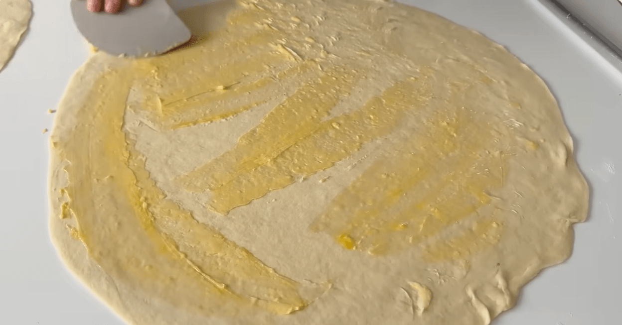 Svaku kuglu razvaljajte u krug promjera približno 40–45 cm. Prvi krug stavite na radnu površinu i premažite ga mekanim puterom. Preko njega položite drugi krug tijesta i ponovo premažite puterom. Isto ponovite i s trećim slojem.