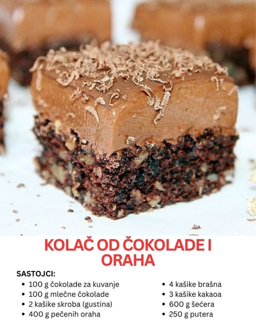 Nakon toga, torta se vraća u frižider da se glazura stegne. Kada je spremna, treba je iseći na precizne kockice oštrim nožem. Svaka kockica pruža divno čokoladno iskustvo, sa slojem raskošne kreme, nežnom koricom od oraha i sjajnom glazurom koja se rastvara na nepcu.