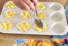 Za desert su vam potrebni sljedeći sastojci: 3 jaja, 150 g (¾ šalice) šećera, 150 g (⅔ šalice) otopljenog maslaca, 175 g (1 šalica plus 3 žlice) višenamjenskog brašna, 1 žličica praška za pecivo, 1 žličica ekstrakta vanilije, ½ žličice esencije badema (po želji), 3 žlice običnog jogurta, 50 g (¼ šalice) maslaca od kikirikija i čokoladni posip za preljev po ukusu.