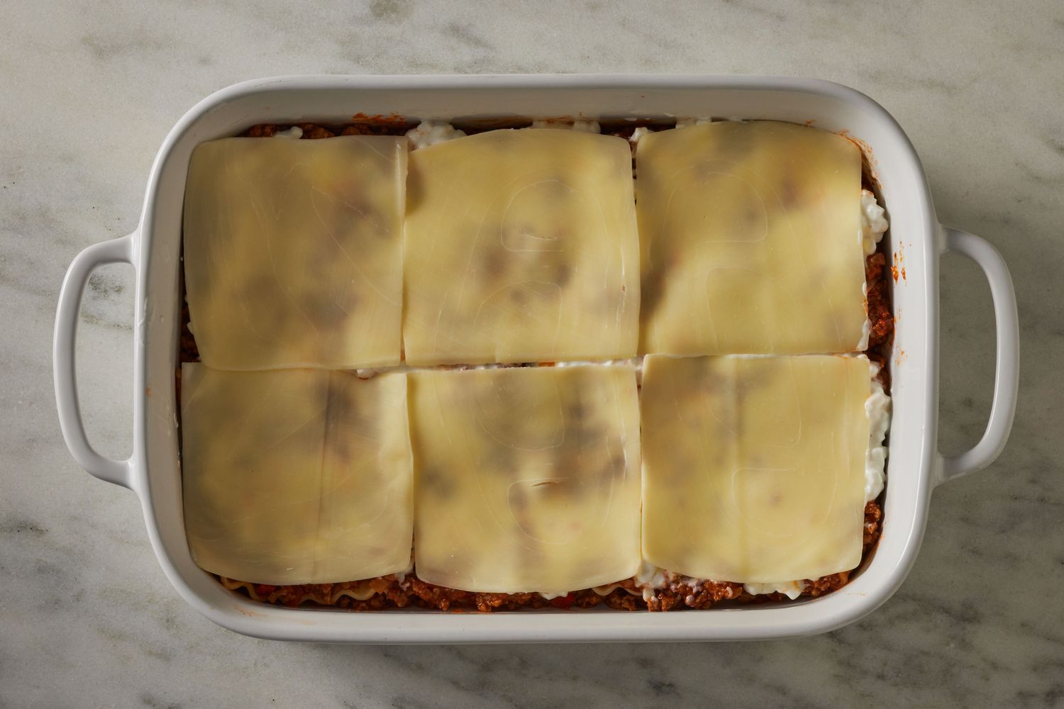 Umiješajte rezance tako da složite 3 rezanaca za lazanje na umak, pazeći da potpuno prekriju površinu. Nakon toga, ravnomjerno rasporedite smjesu sira nanošenjem ⅓ pripremljene smjese krem sira preko rezanaca, poravnavajući je kako biste formirali jednoličan sloj.