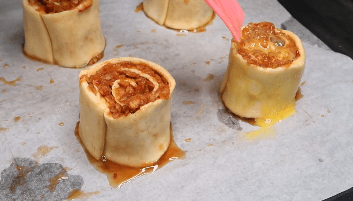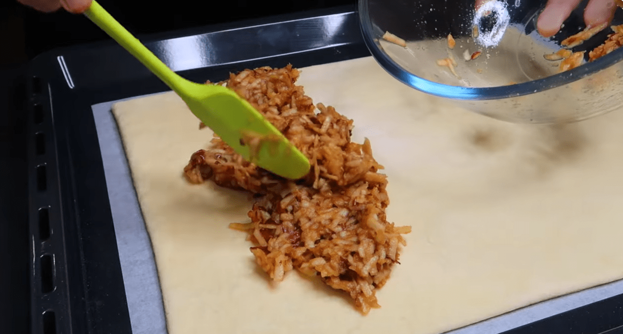 Na sredinu svakog kvadrata stavite po jednu kašiku nadjeva od jabuka, pazeći da ne pretjerate kako tijesto ne bi pucalo. Preklopite uglove tijesta prema sredini i blago pritisnite rubove kako bi se zatvorili i formirali mali džepovi.