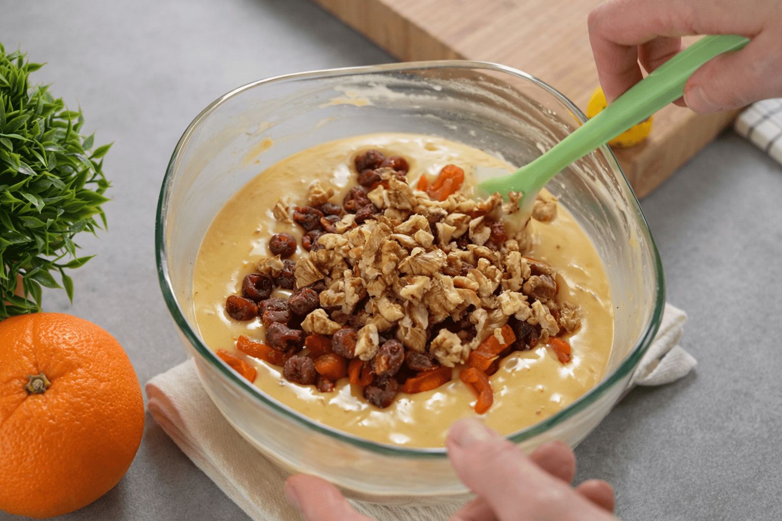 Na kraju dodajte naribanu koru narandže, sjeckane suhe kajsije, trešnje i orahe, ravnomjerno ih raspoređujući kroz smjesu. Tijesto izlijte u pripremljeni kalup i poravnajte površinu.