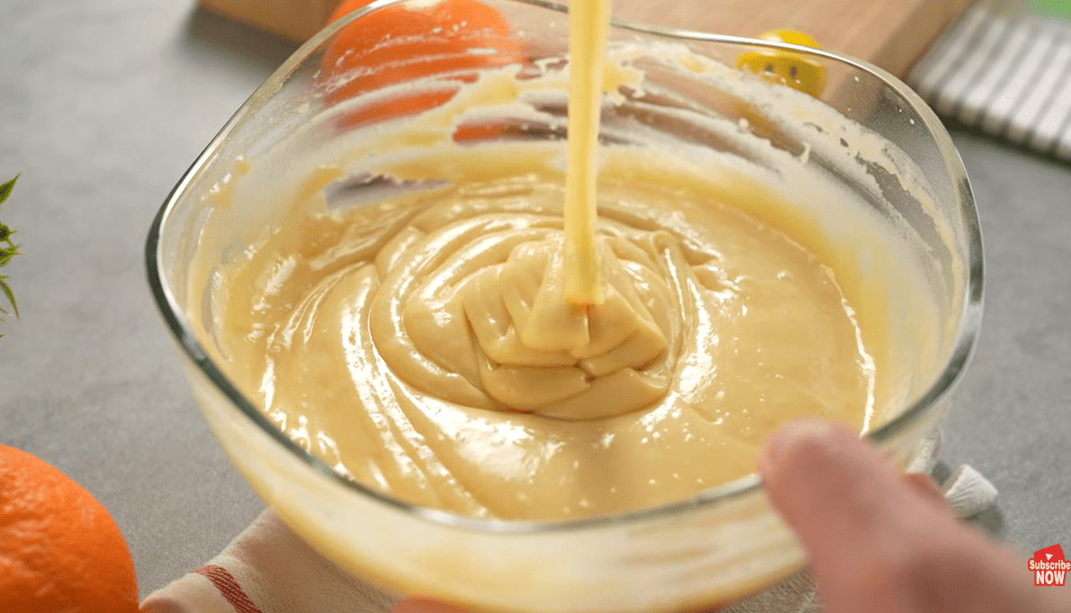 U većoj zdjeli umutite jaja sa soli, vanilijom i šećerom dok smjesa ne postane svijetla i pjenasta. Dodajte ulje i mlijeko, pa sve dobro promiješajte. Posebno pomiješajte brašno i prašak za pecivo te ih postepeno umiješajte u tečnu smjesu dok ne dobijete glatko tijesto.