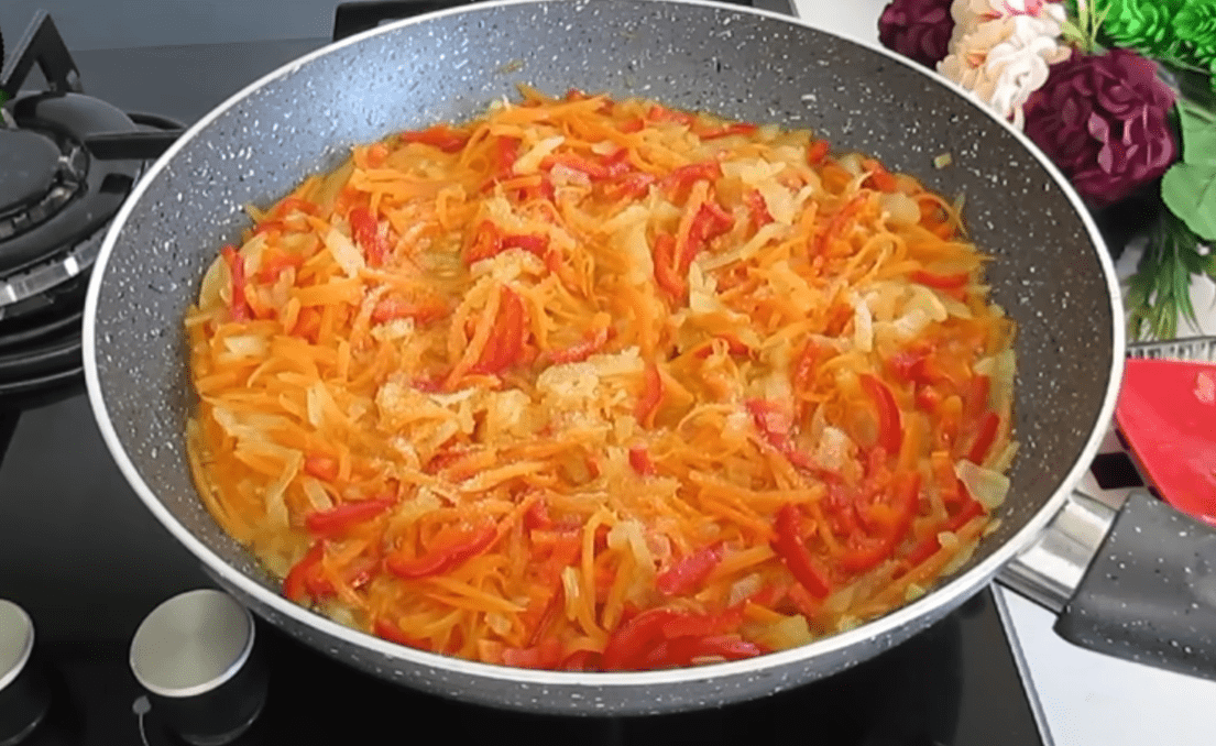 Zatim dodajte mrkvu i nastavite pirjati još par minuta, a nakon toga ubacite i crvenu papriku. Sve zajedno kuhajte dok povrće ne omekša i počne lagano puštati aromu. Na kraju dodajte peršin, malo soli i papra, pa sklonite sa vatre.