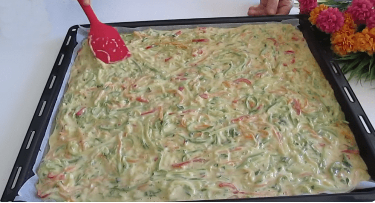 Pripremite lim za pečenje tako što ćete ga obložiti papirom za pečenje i lagano premazati uljem. Izlijte smjesu i ravnomjerno je rasporedite po limu.