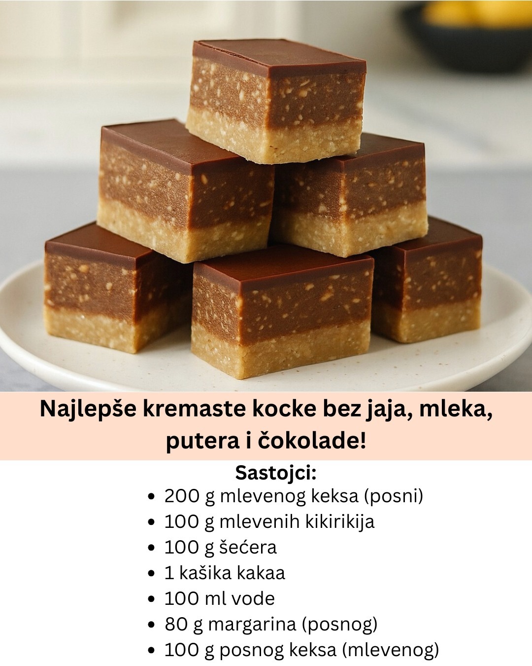 Osnovni sloj: 200 grama mlevenih keksa sa niskim sadržajem masti, 100 grama mlevenog kikirikija, 100 grama šećera, 1 kašika kakao praha, 100 mililitara vode i 80 grama posnog margarina.