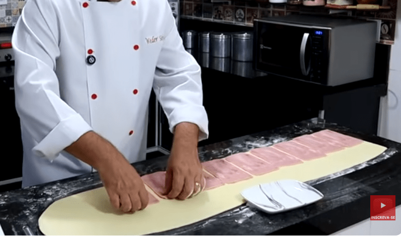 Svaki dio razvaljajte u tanak pravougaonik. Po sredini nanesite tanki sloj sosa, zatim rasporedite šunku i sir.