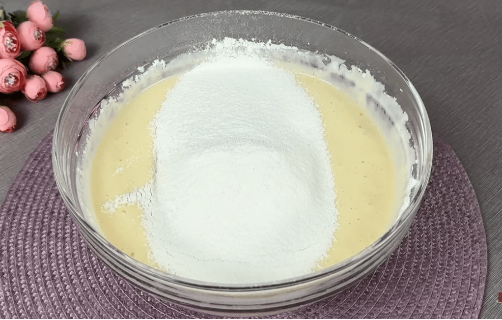 Umiješajte brašno i prašak za pecivo – dobijate glatko, polutečno tijesto.