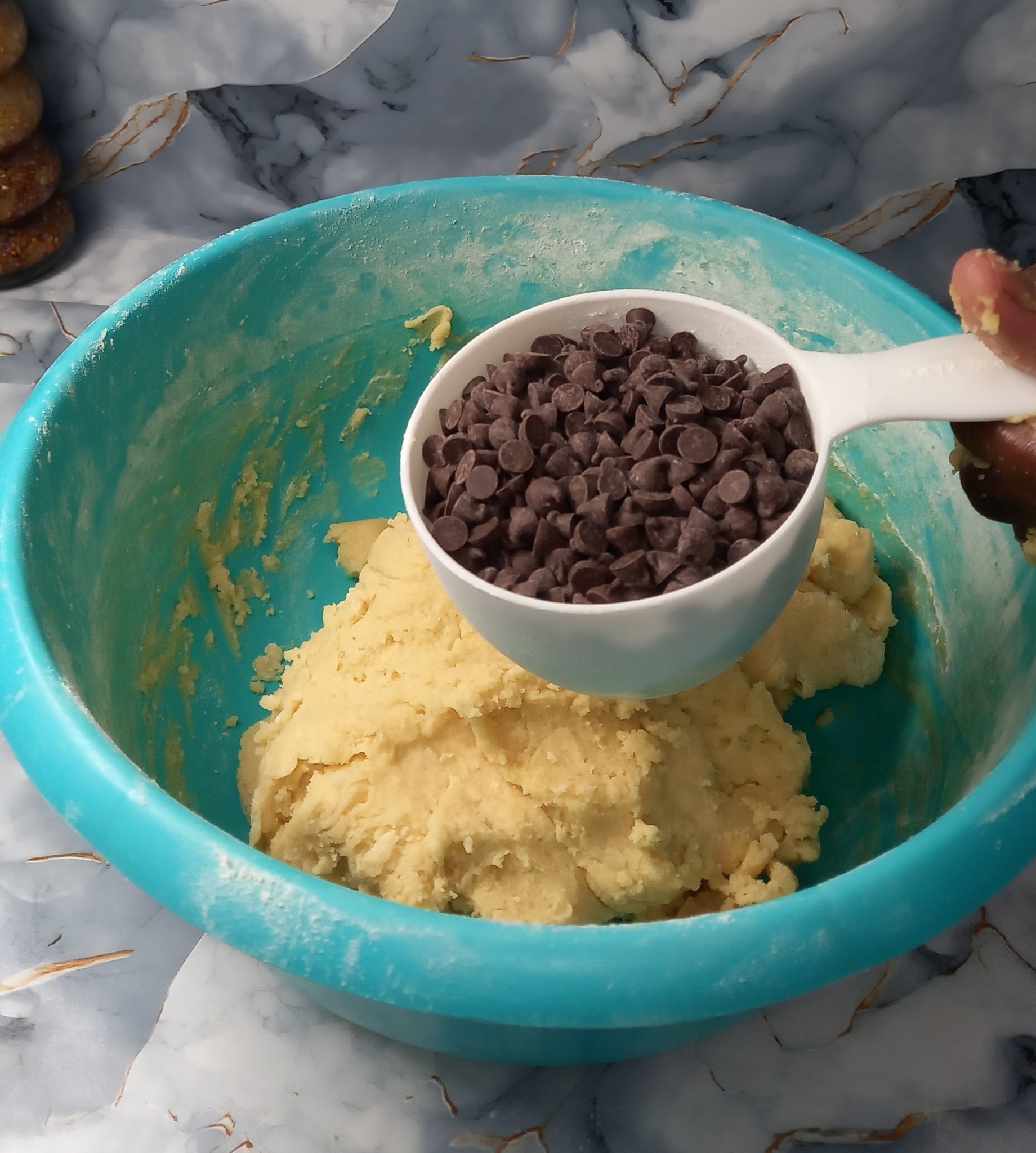 Na kraju dodajte sjeckanu čokoladu i lagano je umiješajte žlicom ili špatulom, kako bi se ravnomjerno rasporedila.