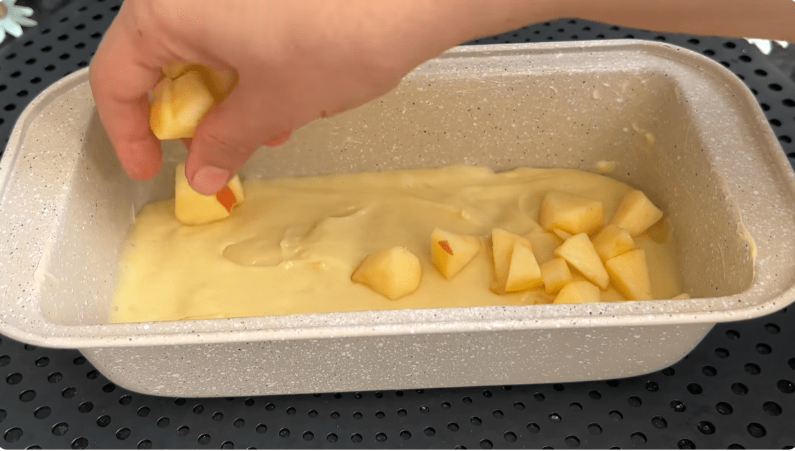 Umiješajte jabuke: Pažljivo umiješajte polovicu kriški jabuke u tijesto lagano ih preklapajući. Smjesu prebacite u pripremljeni kalup, pazeći da se ravnomjerno rasporedi. Nakon toga, preostale kriške jabuke rasporedite po površini na estetski ugodan način.
