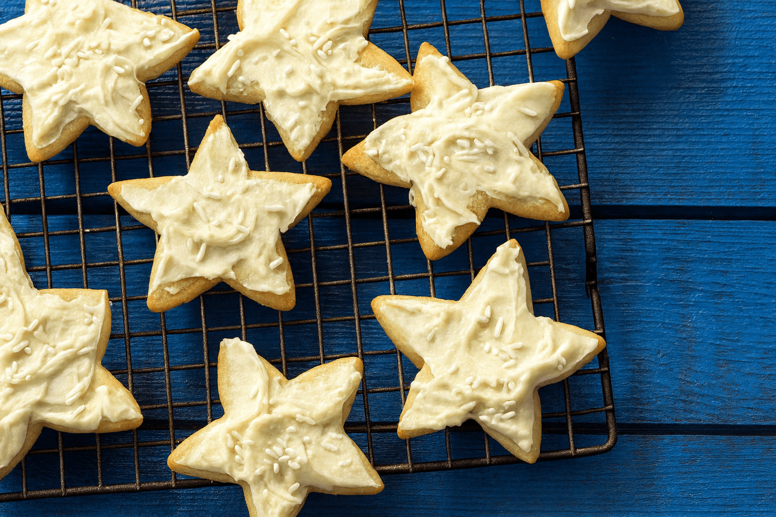 Zvjezdaste kekse stavite na lim za pečenje obložen papirom za pečenje i pecite u prethodno zagrijanoj pećnici otprilike 8 do 10 minuta ili dok ne dobiju svijetlosmeđu boju. Ostavite kekse da se ohlade na rešetki za hlađenje.