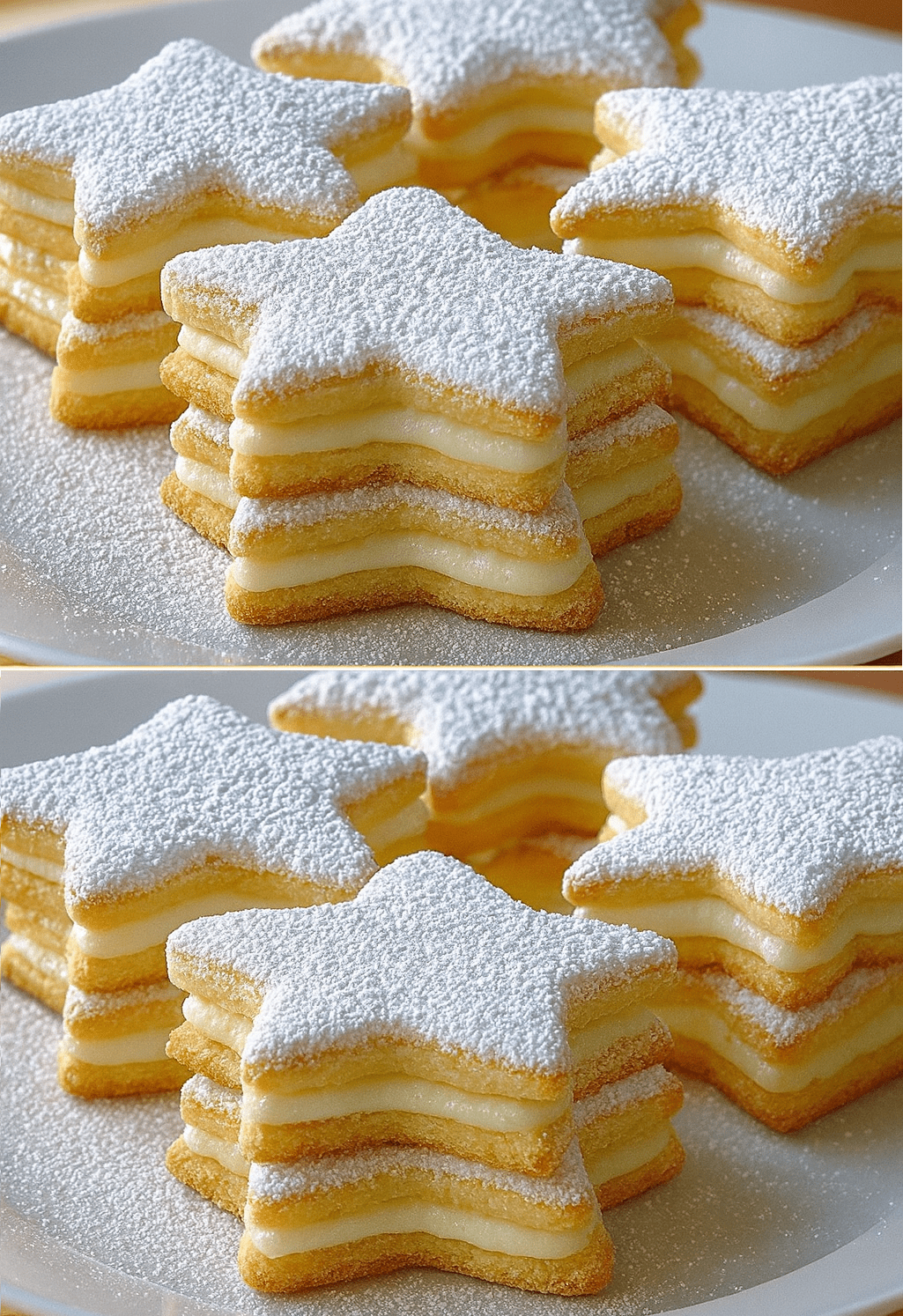 Započnite s jednim keksom u obliku zvijezde, nanesite sloj kreme od vanilije na njega, a zatim na vrh stavite još jedan keks u obliku zvijezde. Lagano pritisnite.