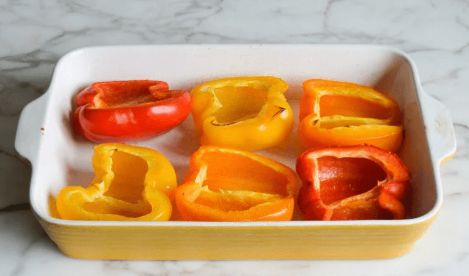 Zagrijte pećnicu na 180 stupnjeva Celzija (350 stupnjeva Fahrenheita). Premažite svaku papriku izvana maslinovim uljem i stavite ih u posudu za pečenje. Unutrašnjost začinite solju i paprom.
