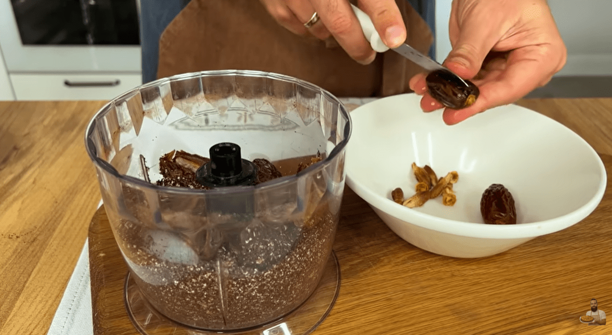 U kuhinjski robot dodajte ocijeđene hurme, zobene pahuljice, kakao, orahe i med. Miksajte dok ne dobijete ujednačenu, ljepljivu smjesu.