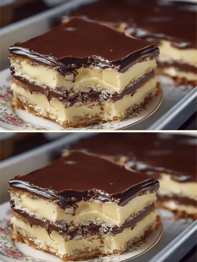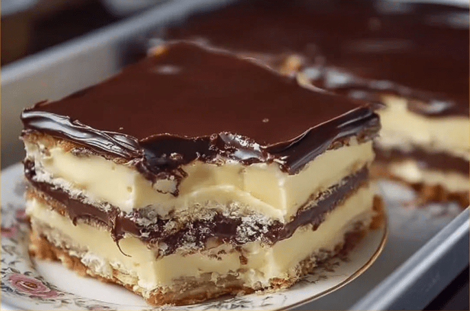 Jednostavan, a opet prepun okusa, kolač Eclair bez pečenja predstavlja se kao izvrstan desert koji podsjeća na tradicionalno francusko pecivo, a sve to bez potrebe za pečenjem. Idealan za toplije klime ili prigode kada želite slatki užitak bez komplikacija korištenja pećnice, ovaj kolač ima preljev od baršunastog pudinga od vanilije, prozračnog šlaga i raskošne čokoladne glazure. Služi kao izvrstan izbor za okupljanja, obiteljske obroke ili bilo koju svečanu proslavu!