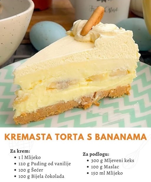 (ČPP) Često postavljana pitanja – Kremasta torta od banana: Koliko dugo se torta može čuvati u hladnjaku? Torta se može čuvati u hladnjaku najviše 3 dana; međutim, za optimalan okus i kvalitetu preporučuje se konzumirati unutar 48 sati zbog prisutnosti svježih banana.