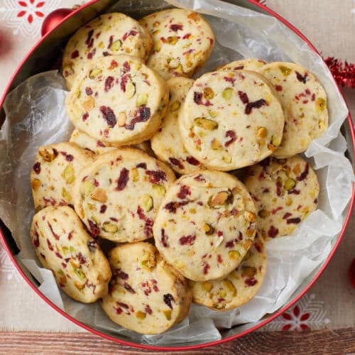 Ukusna kombinacija kiselih brusnica i orašastih pistacija s maslačnim bogatstvom karakterističnim za tradicionalne prhke kekse rezultira ovim izvrsnim keksima od prhkog tijesta s brusnicama i pistacijama. Idealni za blagdanska okupljanja, darivanje ili jednostavno uživanje uz popodnevni čaj, ovi keksi nude elegantan dodir. Njihov prekrasan izgled boje dragulja, uparen s teksturom koja se topi u ustima, osigurava da pružaju i vizualnu privlačnost i izvanredan okus za svaki događaj.