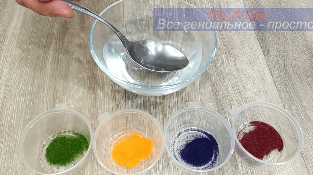 Zatim pripremite boje tako što ćete u svaku čašu staviti po jednu kesicu boje, dodati kašiku hladne vode i kašiku ohlađenog sirćeta. Sve dobro promiješajte dok se boja potpuno ne rastvori.