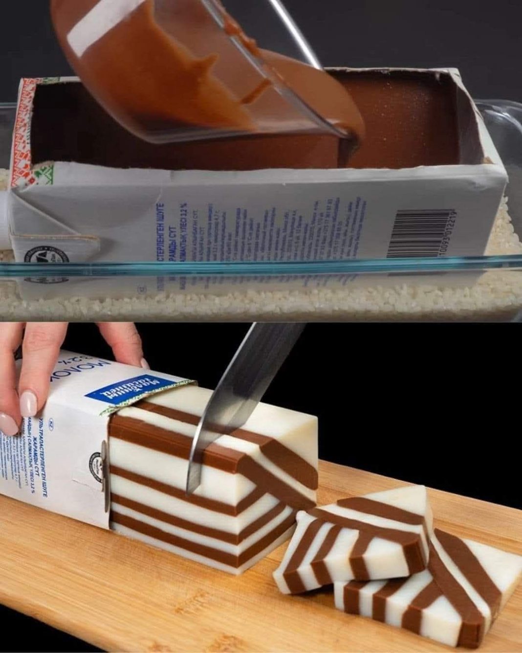 Dodajte agar-agar: Dodajte otopljeni agar-agar u smesu sa čokoladom, neprekidno mešajući kako biste sprečili stvaranje grudvica. Prebacite na sloj čokolade: Kada se sloj mleka stvrdne, pažljivo prelijte sloj čokolade preko. Ostavite smesu da se ohladi pre nego što je stavite u frižider na 30 do 40 minuta da se pravilno stegne.