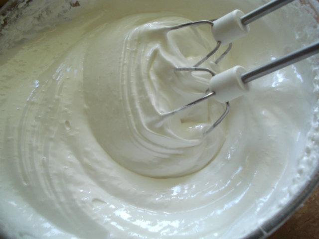 U umućene bjelanjke umiješati agdu i mikserom dobro izmiksati. Obavezno snažno tući bjelanjke, kontinuirano dok se kora peče, a tučenje posebno pojačati prilikom dodavanja agde.