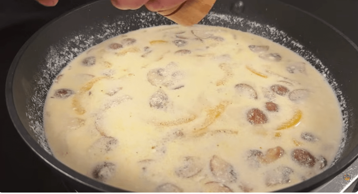 U smjesu se dodaju vrhnje i temeljac, čime se dobija kremasti umak. Lagano kuhanje omogućava da se svi okusi povežu i da se umak zgusne do idealne teksture.