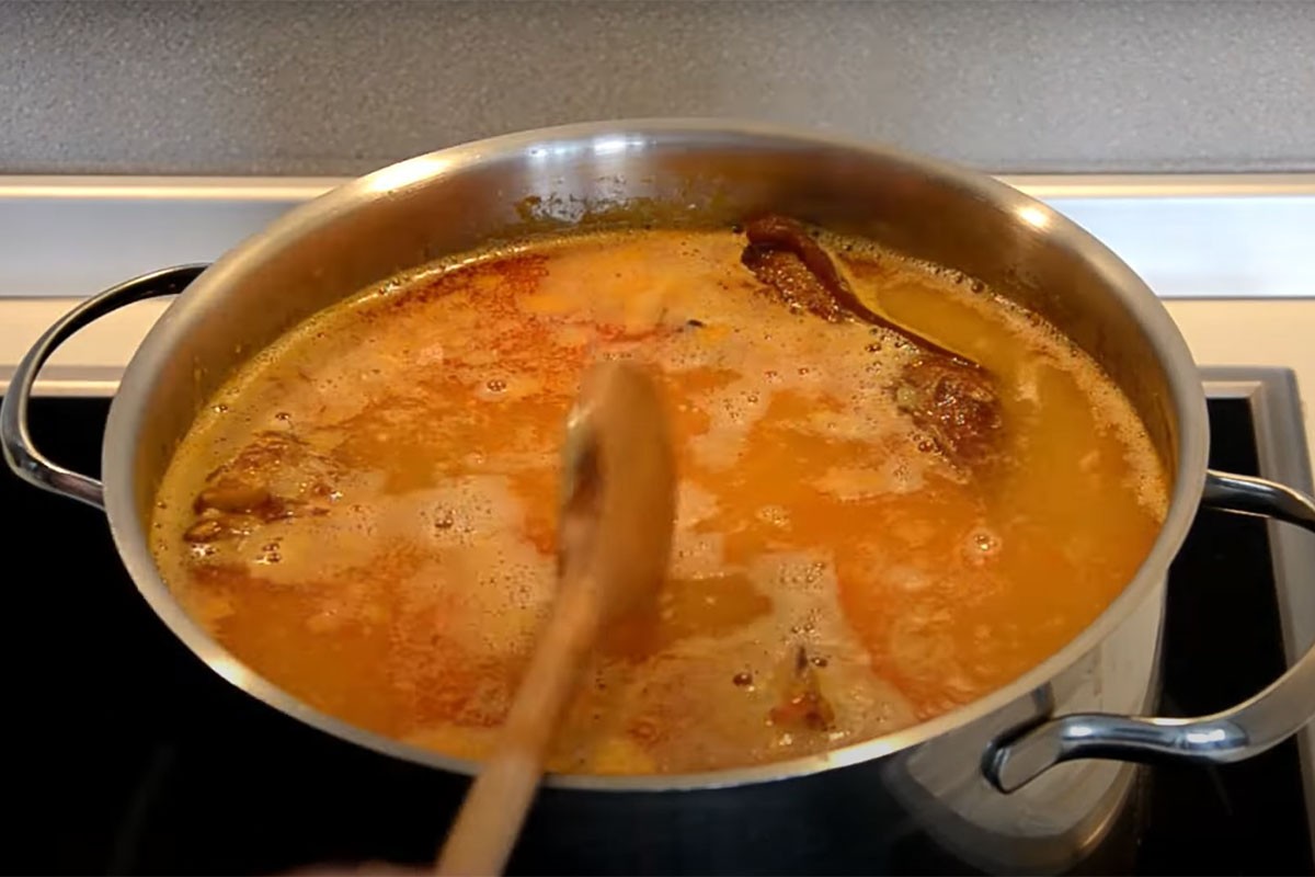 Pred sam kraj kuhanja dodajte čašu rasola i ostavite još 10–15 minuta da se gulaš zgusne i dobije pun, zaokružen okus.