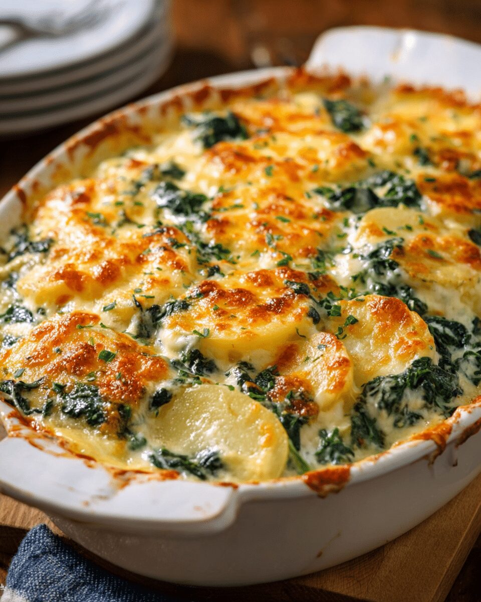 Podrijetlo i inspiracija iza jela Ovo jelo crpi inspiraciju iz utješnih kulinarskih tradicija Europe, posebno francuskog i talijanskog stila gratina krumpira, koji kombiniraju krumpir s vrhnjem, sirom i povrćem. Dodatak špinata uvodi suvremeni i zdravi element koji poboljšava nutritivni profil, a istovremeno osigurava da jelo ostane zadovoljavajuće i ukusno. Služi kao izvrsna metoda za pretvaranje uobičajenih sastojaka u obrok koji utjelovljuje i rustikalni šarm i eleganciju.