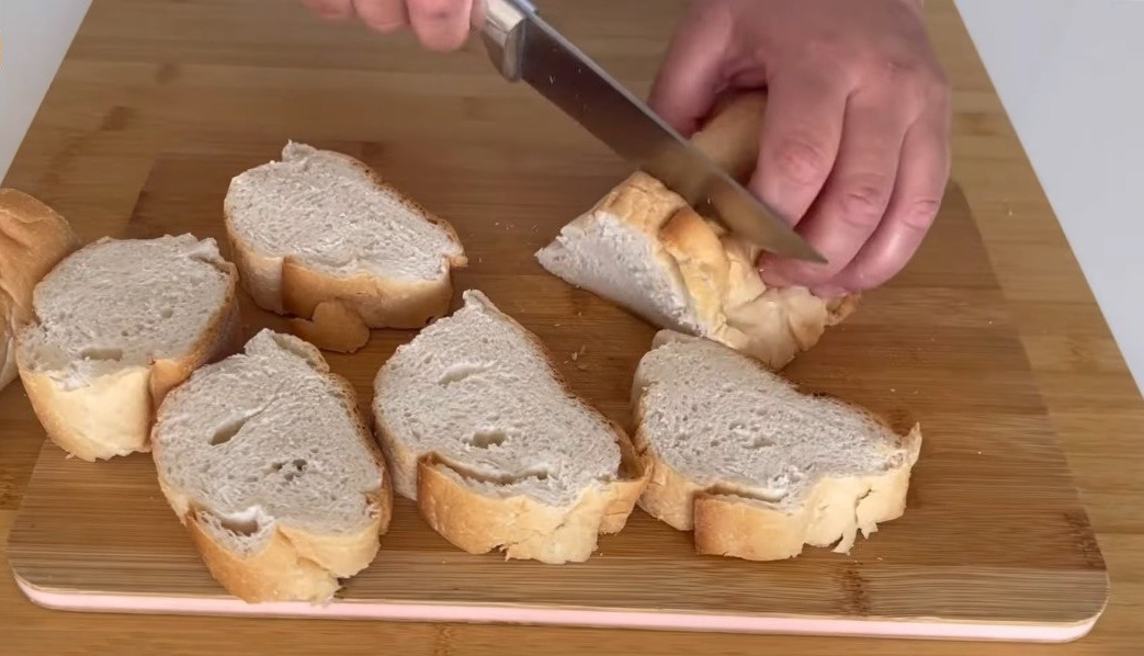 Narežite hljeb na tanke kriške i pripremite lim za pečenje obložen papirom.