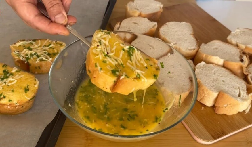 Pecite u prethodno zagrijanoj rerni na 180°C (350°F) dok hljeb ne poprimi zlatno-smeđu boju i postane hrskav, otprilike 10–15 minuta.