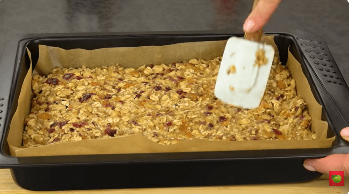 Pripremite posudu za pečenje: Počnite tako što ćete malu posudu za pečenje, veličine otprilike 20×20 cm, obložiti papirom za pečenje. Koristeći poleđinu kašike, čvrsto i ravnomerno pritisnite smesu u posudu. Pecite u rerni zagrejanoj na 180°C (360°F) 20 minuta, ili dok ivice ne dobiju svetlo zlatnu boju, a štapići ne postanu čvrsti na dodir.
