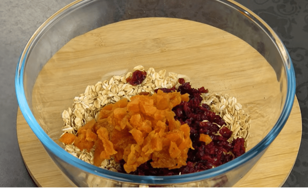 Za osnovu su potrebni sledeći sastojci: 50 grama (½ šolje / 1,8 unci) sušenih brusnica, 80 grama (½ šolje / 2,8 unce) sušenih kajsija, 100 grama (1 šolja / 3,5 unce) ovsene kaše, 1 kašika lanenog semena, 1 kašika ljuski psilijuma, 1 kašika kokosovih pahuljica, 70 grama (½ šolje / 2,5 unce) prepečenih i seckanih lešnika, 70 grama (½ šolje / 2,5 unce) prepečenih i seckanih badema i 2 zrele banane (izgnječene).